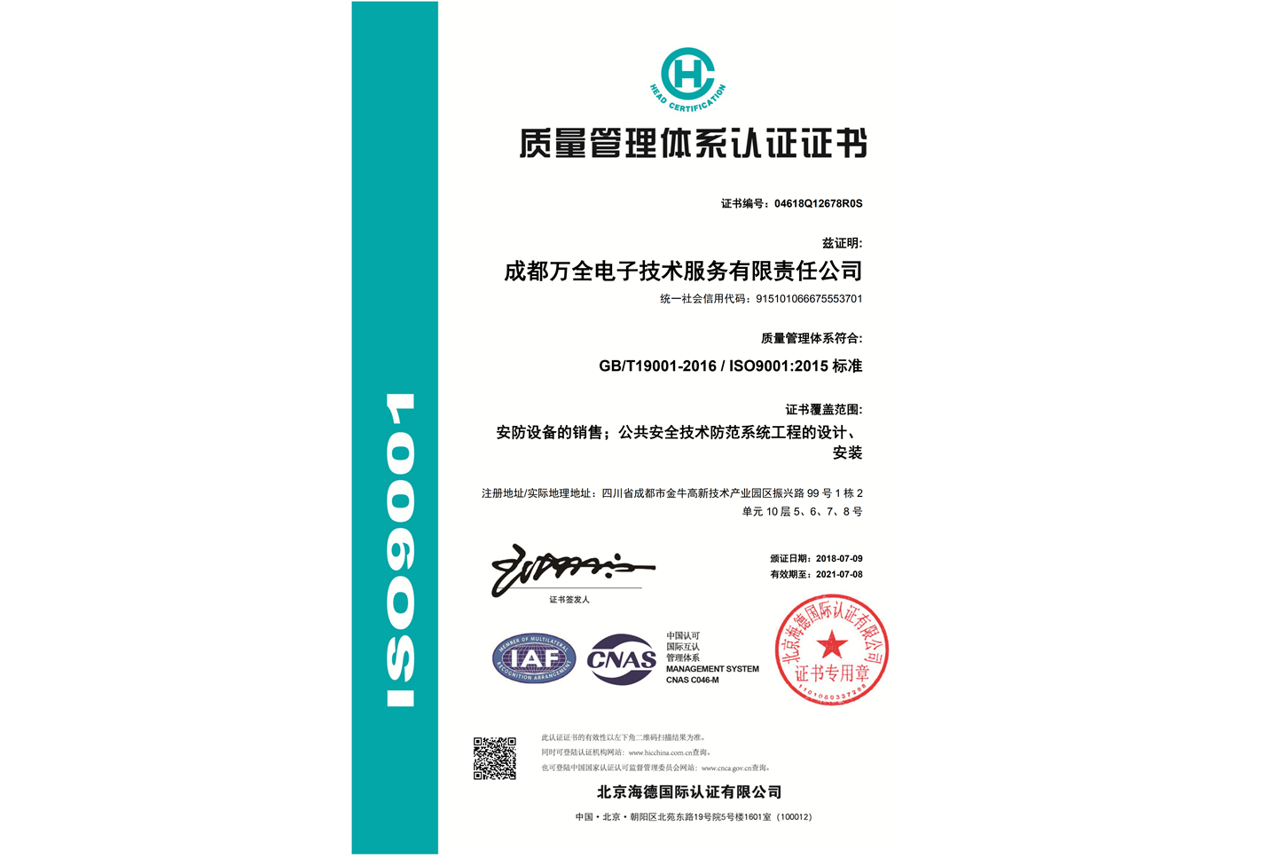 2018年7月31日,安防工程商成都萬全電子通過ISO9001質量管理體系認證。